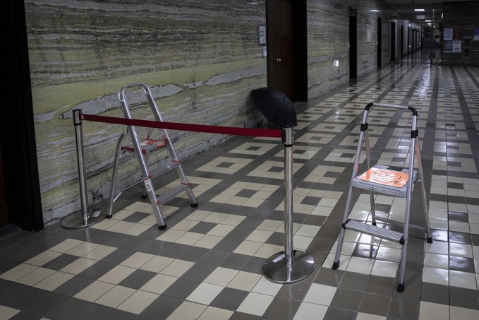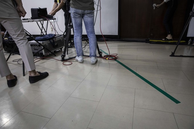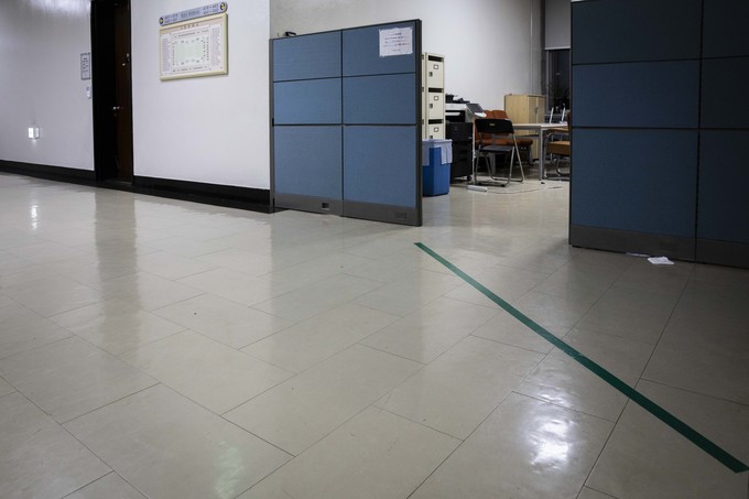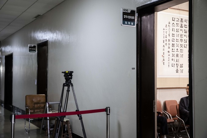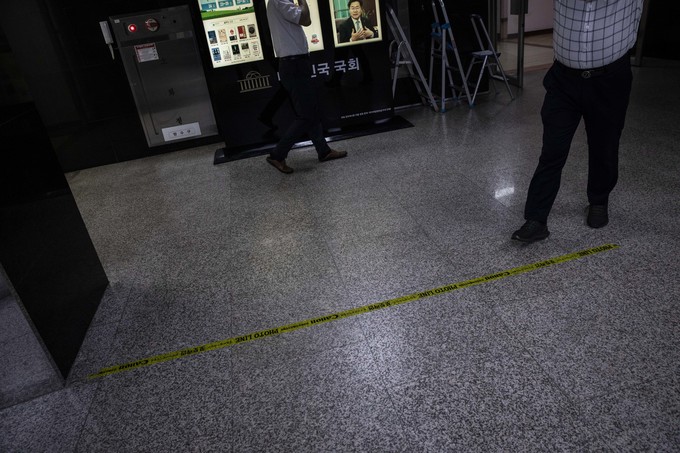 조국 법무부장관 후보자 인사청문회가 열린 6일 오후 서울 여의도 국회 본청 복도에 조 후보자 동선에 따라 취재진 포토라인 테이프가 붙어 있다.