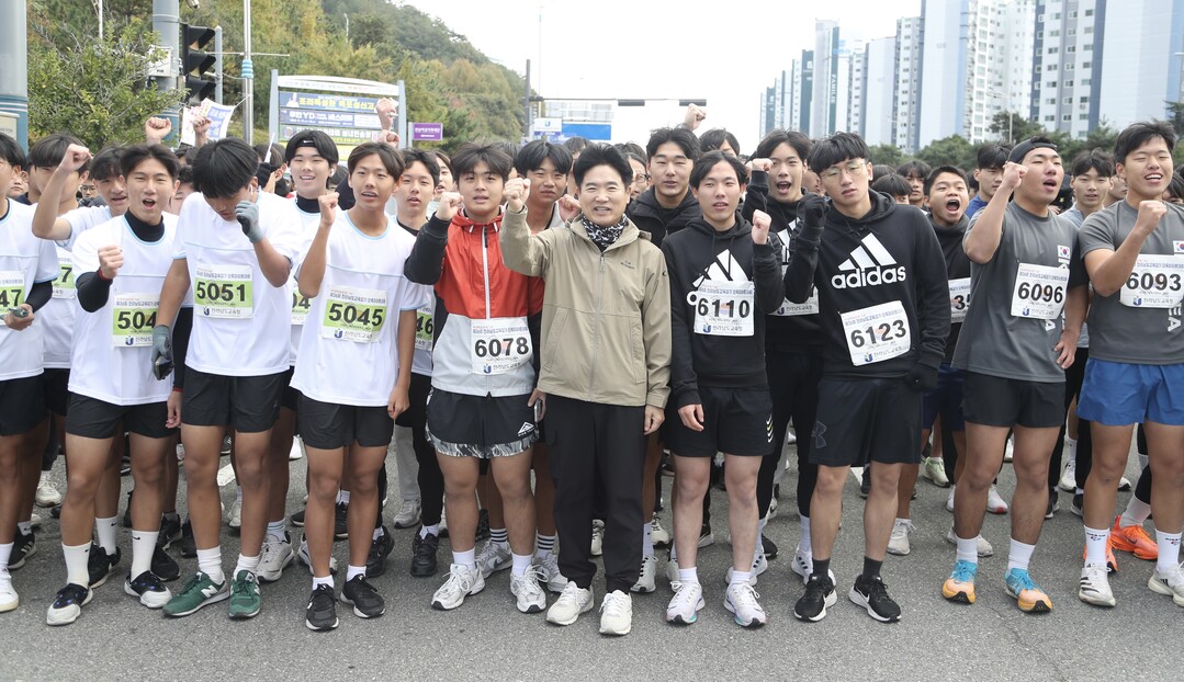 | ▲ 11일 김대중 교육감과 대회 참가자들이 제36회 전라남도교육감기 단축마라톤대회 개최 전 파이팅을 외치고 있다. [전남교육청 제공] |