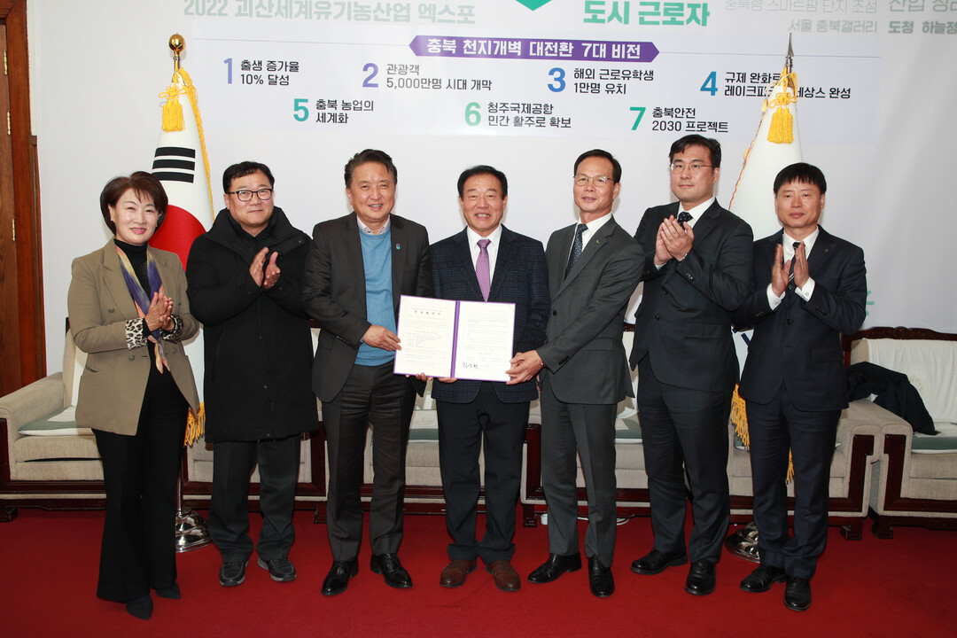 | ▲투자협약서를 들고 있는 디에스테크노 안학준 대표와 김영환(좌)지사, 조병옥 군수.[충북도 제공] |
