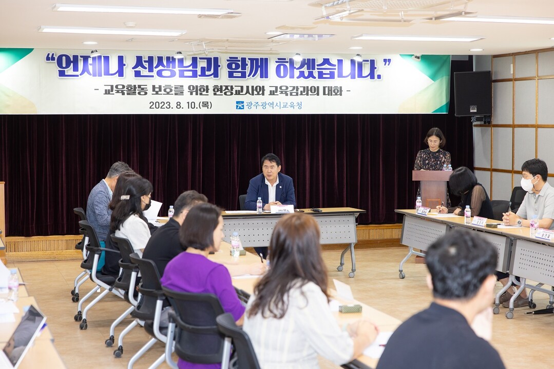 | ▲ 이정선 광주시교육감이 지난달 10일 교육활동 보호를 위한 현장교사와 대화에 나서고 있다. [광주시교육청 제공] |