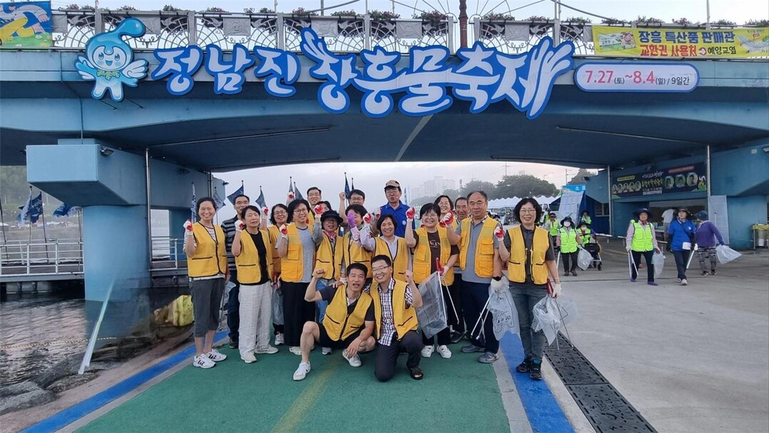 | ▲ 제17회 정남진 장흥 물축제 민간 자원봉사자들이 새벽 5시부터 축제장 곳곳에 있는 쓰레기를 주우며 청소 봉사로 구슬땀을 흘리고 있다. [장흥군 제공] |