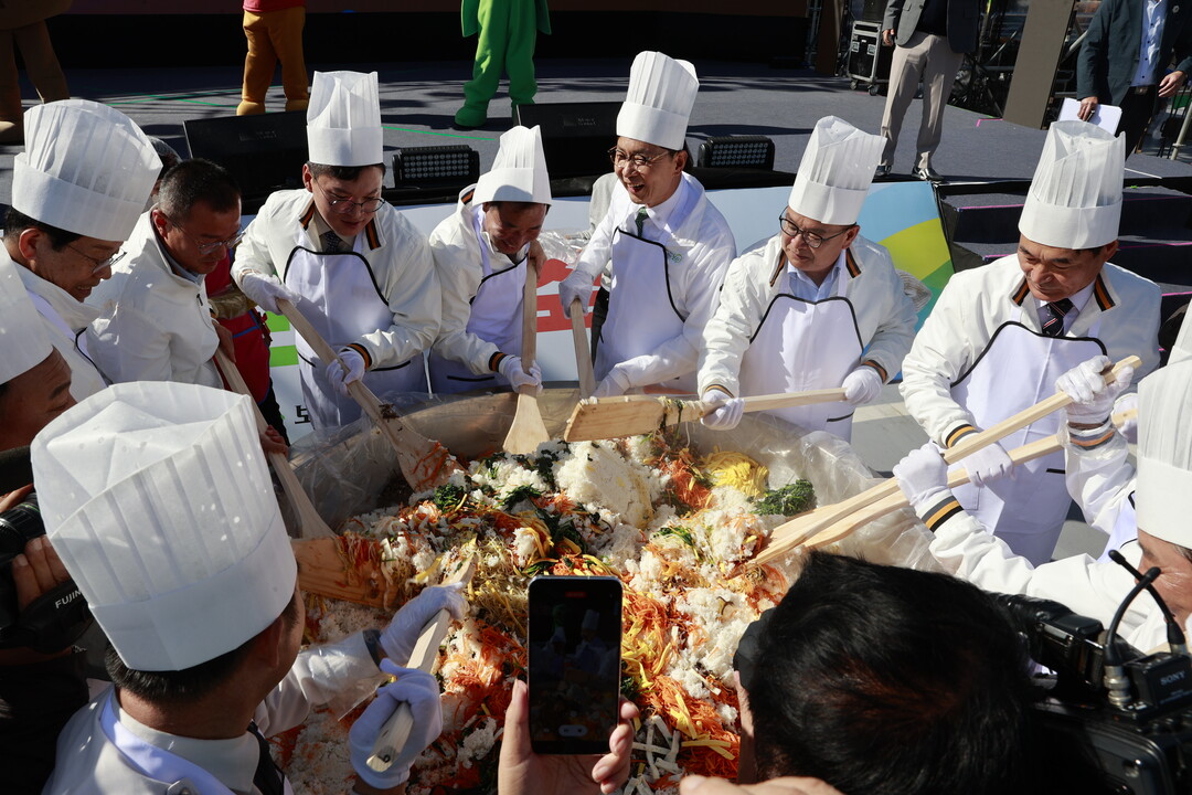 | ▲ 27일 김철우 군수가 제19회 벌교꼬막축제 행사에서 1000인분의 꼬막비빔밥을 비비고 있다. [보성군 제공] |