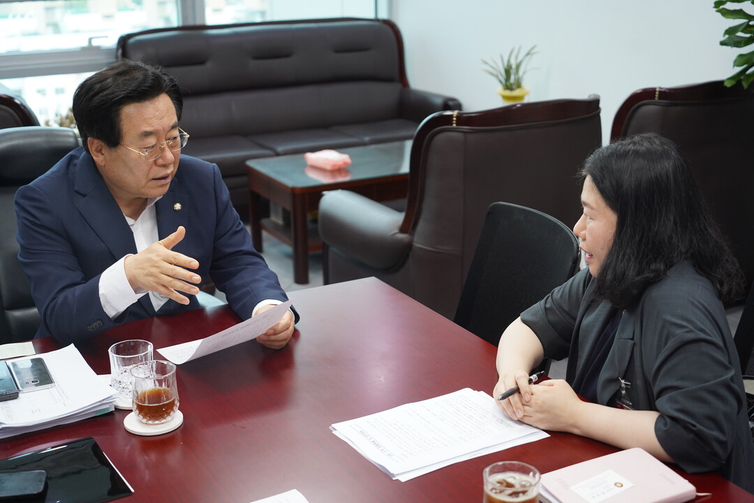 | ▲ 박상웅 의원이 2일 농축산부 재해보험정책과장으로부터 '밀양 냉해·우박 피해 현황'을 보고받고 있다. [박상웅 의원 사무실 제공] |