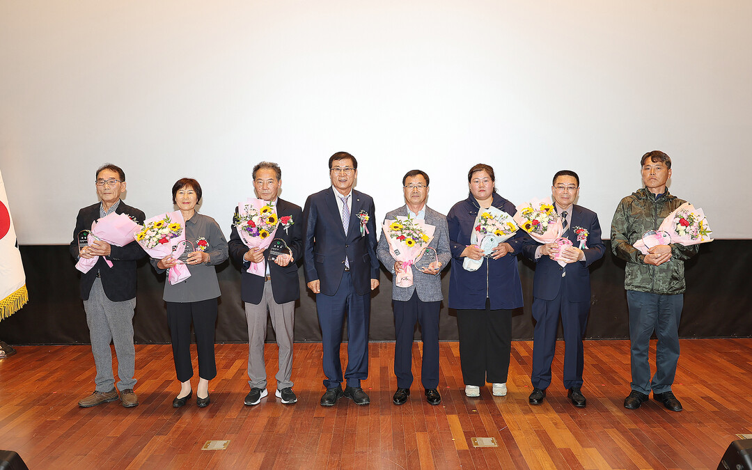 | ▲ 6일 이상익 함평군수가 함평엑스포공원 주제영상관에서 효행자 9명에게 표창패를 전수한 뒤 기념촬영을 하고 있다. [함평군 제공] |