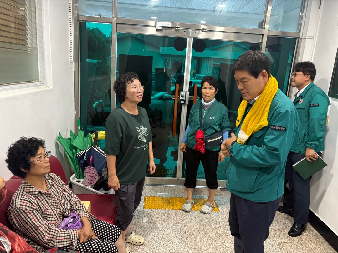 | ▲ 정철원 전남 담양군수가 17일 내린 극한폭우로 거주지 침수피해를 입고 봉산면사무소로 대피한 삼지리 마을주민에게 위로와 안부를 묻고 있다. [담양군 제공] |