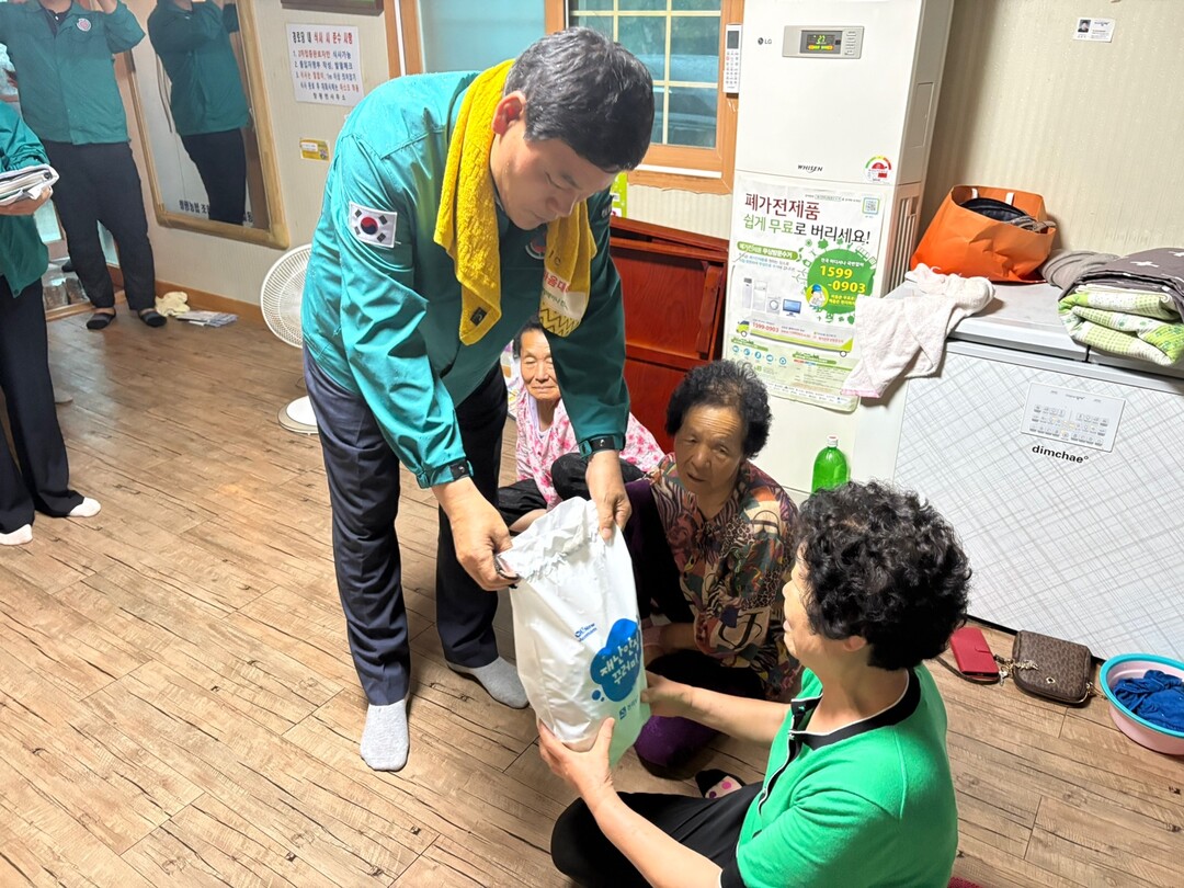 | ▲ 정철원 전남 담양군수가 17일 내린 극한폭우로 거주지 침수피해를 입고 봉산면사무소로 대피한 삼지리 마을주민에게 재난안전꾸러미를 전달하고 있다. [담양군 제공] |