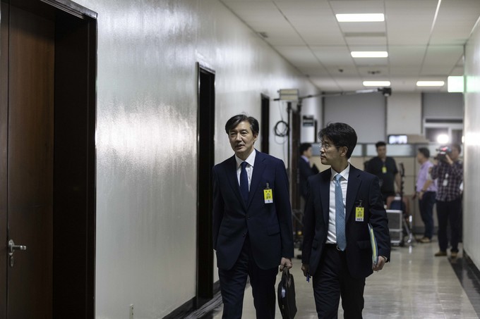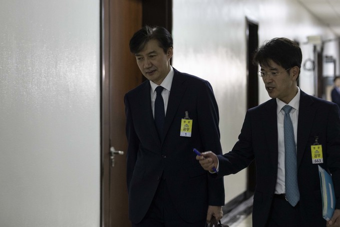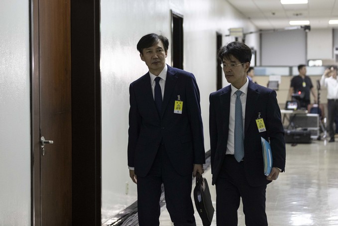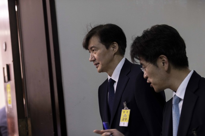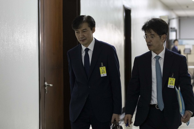 6일 오전 10시부터 시작된 조국 법무부장관 후보자 인사청문회가 저녁까지 이어지고 있는 가운데 휴식을 마친 조 후보자(왼쪽)가 청문회장으로 들어가고 있다.