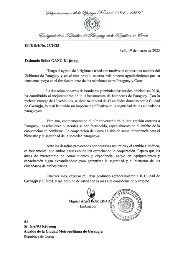 로메로 주한 파라과이 대사는 서한문에서 "파라과이와 한국 간 우호적 관계 증진을 위해 지속적인 관심과 아낌없는 지원을 해주신 시장님께 감사의 인사를 드린다"며 "광주시의 협력은 파라과이 시민의 안전을 지키는데 중요한 역할을 하며 양국 간 협력의 중요한 사례로 자리잡고 있다"고 밝혔다.