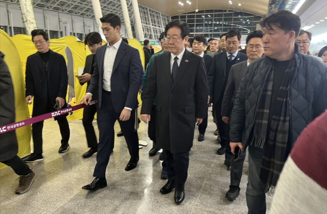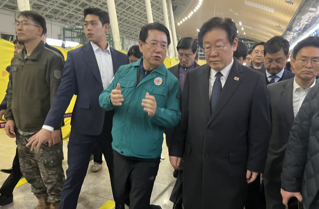 | ▲ 29일 밤 9시쯤 더불어민주당 이재명 대표가 김영록 전남지사 등과 함께 무안국제공항 탑승 수속장 인근에 마련된 유가족 임시대기실을 방문하고 있다. [강성명 기자] |