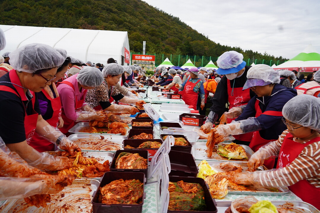 | ▲ 해남미남축제장에서 해남 배추를 활용한 김치담그기 행사가 진행되고 있다. [해남군 제공] |