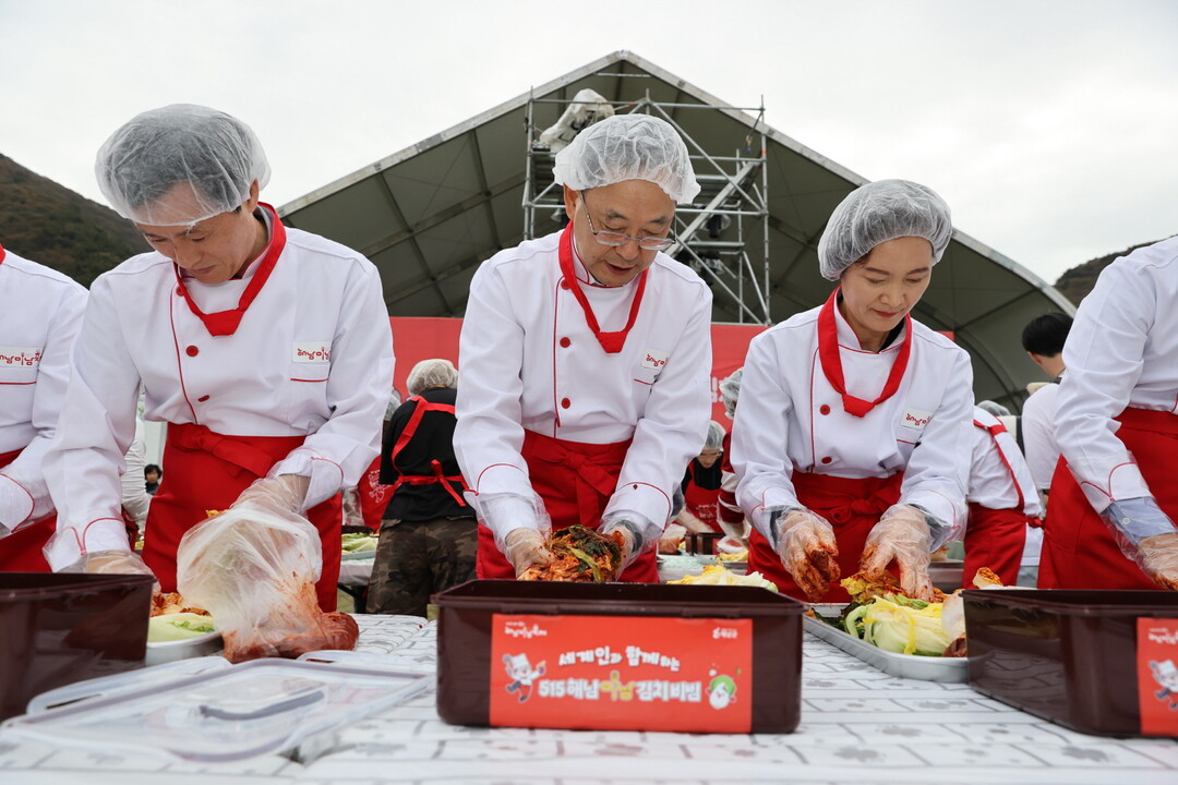 | ▲ 명현관 해남군수가 해남 배추로 김치 담그기를 하고 있다. [해남군 제공 |