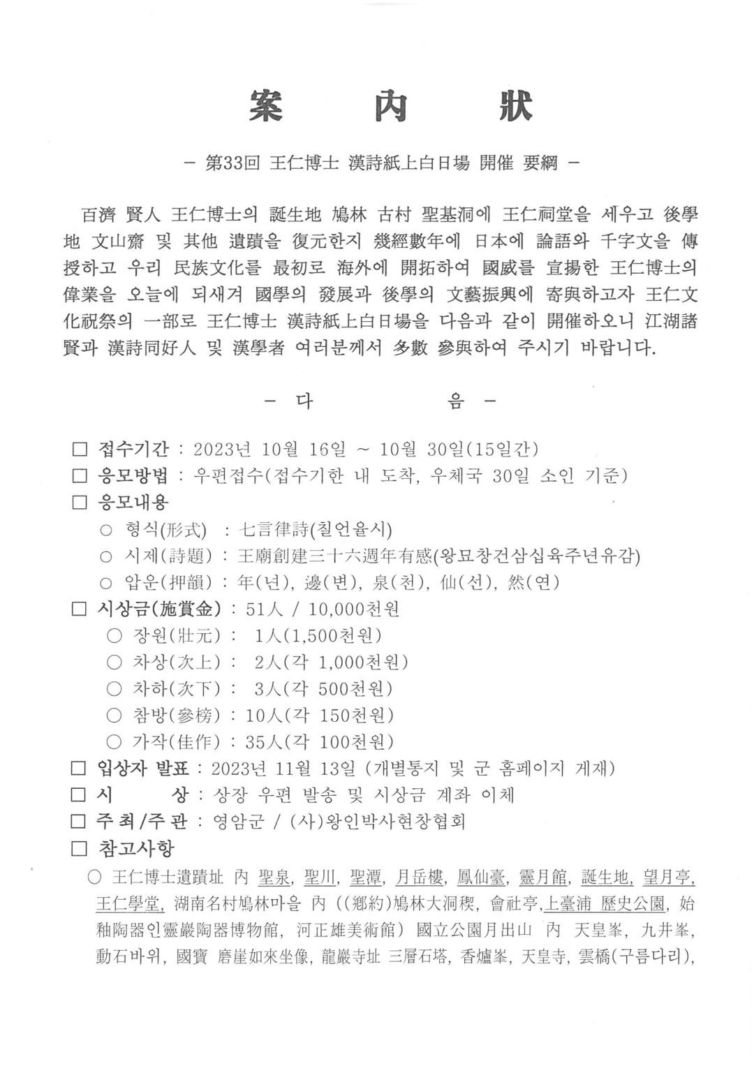 | ▲ 왕인박사 추모 한시 백일장대회 안내장 [영암군 제공] |