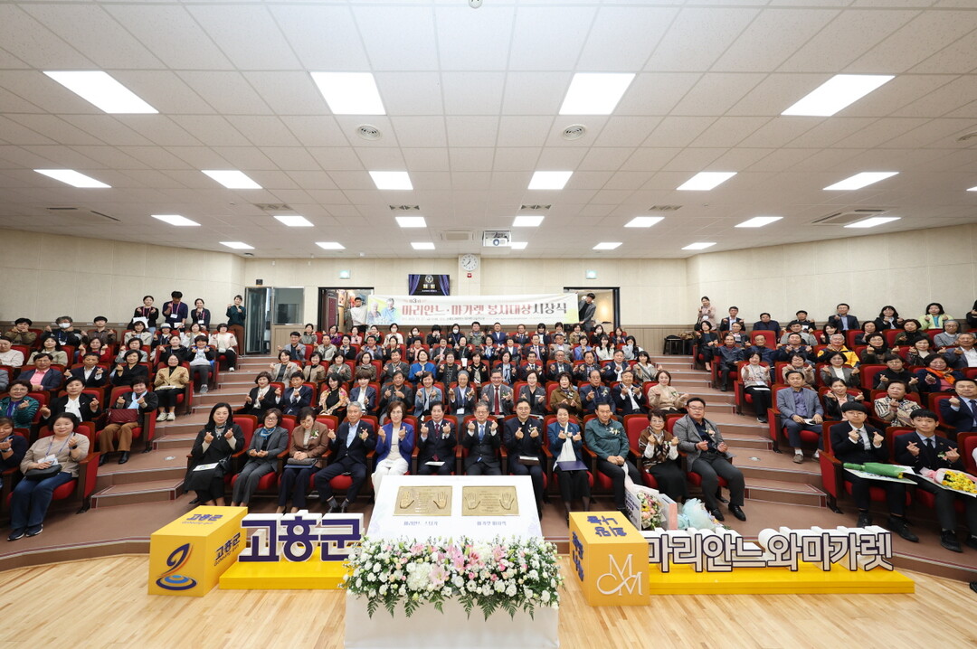 | ▲ 27일 고흥민 고흥군수와 김황식 전 국무총리 등이 제3회 마리안느·마가렛 봉사대상 시상식에서 기념촬영을 하고 있다. [고흥군 제공] |