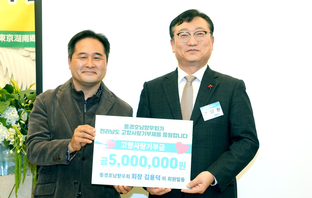 | ▲ 명창환 전라남도 행정부지사가 5일(현지시간) 일본 동경 BATUR Tokyo에서 열린 '동경호남향우회 고향사랑실천 간담회'에서 김용덕 동경호남향우회장으로부터 고향사랑기부금을 전달받고 있다. [전남도 제공] |