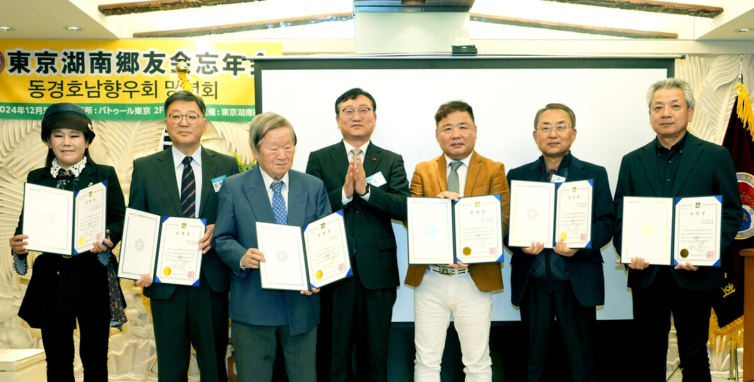 | ▲ 명창환 전라남도 행정부지사가 5일(현지시간) 일본 동경 BATUR Tokyo에서 열린 '동경호남향우회 고향사랑실천 간담회'에서 고향사랑실천 유공자들에게 도지사 표창을 수여하고 기념촬영을 하고 있다. [전남도 제공] |