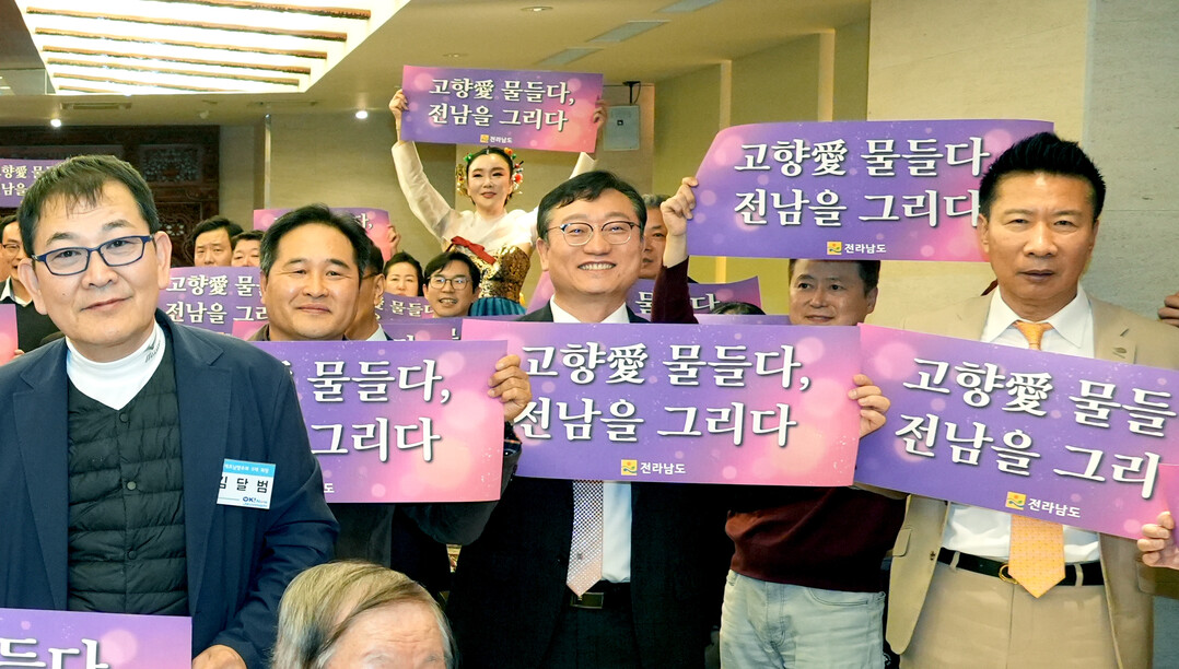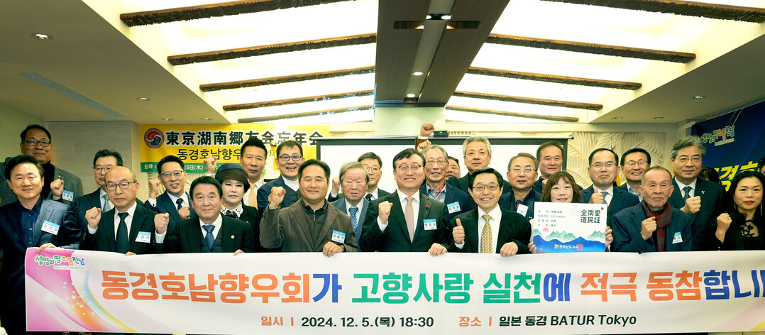 | ▲ 명창환 전라남도 행정부지사가 5일(현지시간) 일본 동경 BATUR Tokyo에서 열린 '동경호남향우회 고향사랑실천 간담회'에서 동경호남향우회 회장단 등 회원들과 고향사랑실천 동참과 전남 사랑애을 다짐하는 퍼포먼스 등 기념촬영을 하고 있다. [전남도 제공] |