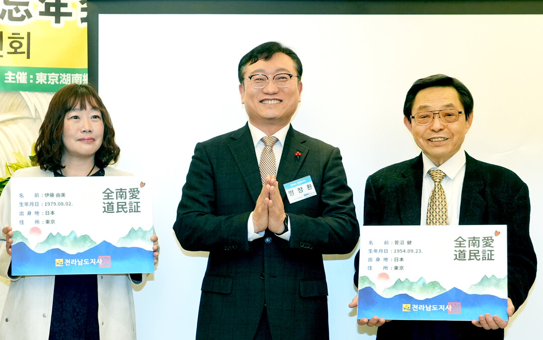 | ▲ 명창환 전라남도 행정부지사가 5일(현지시간) 일본 동경 BATUR Tokyo에서 열린 '동경호남향우회 고향사랑실천 간담회'에서 향우회원에게 전남애 도민증을 전달하고 있다. [전남도 제공] |