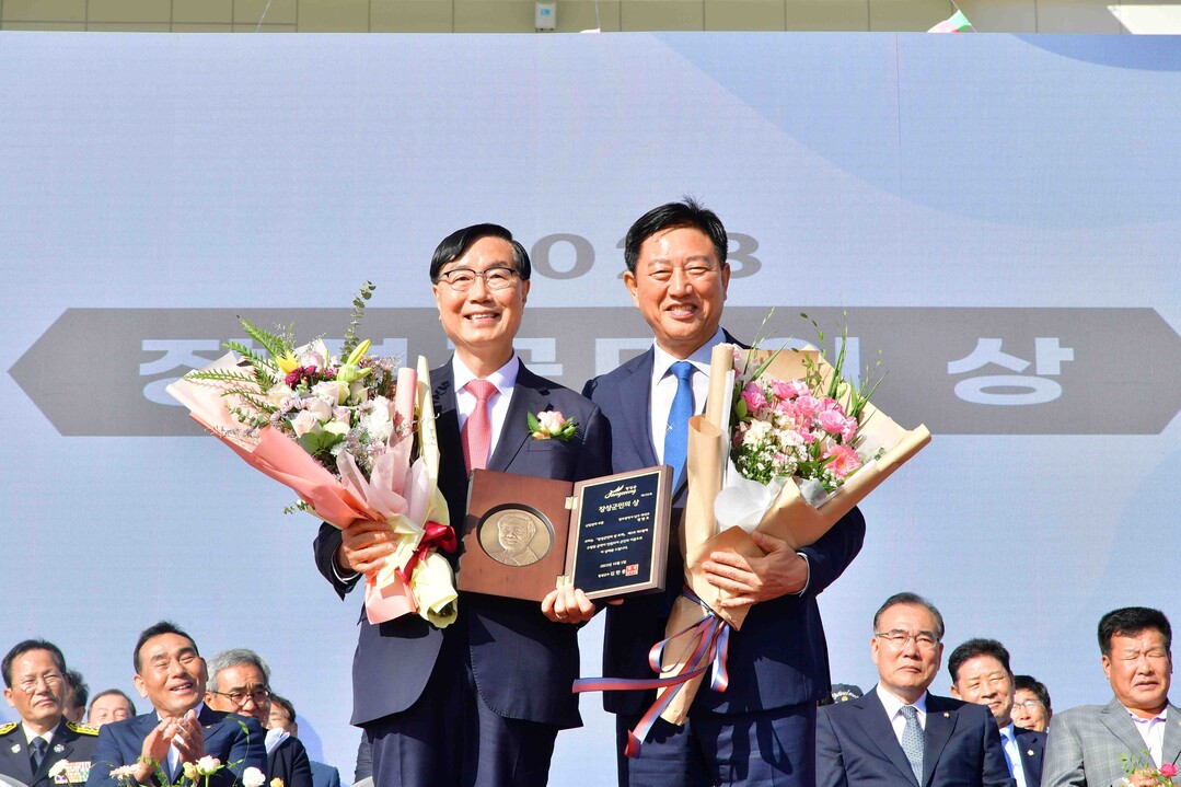 | ▲ 5일 김한종(오른쪽) 장성군수가 정명호 교수에게 장성군민의 상을 전달한 뒤 기념촬영을 하고 있다. [장성군 제공] |