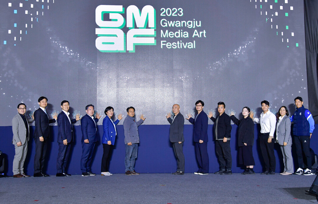 | ▲ 강기정 광주광역시장이 12일 오후 남구 광주미디어아트플랫폼 G.MAP에서 열린 '2023 광주미디어아트페스티벌' 개막식에 참석해 김병내 남구청장, 신수정· 이귀순 시의원, 조관용 총감독 등 내빈들과 개막 퍼포먼스를 하고 있다.[광주광역시 제공] |