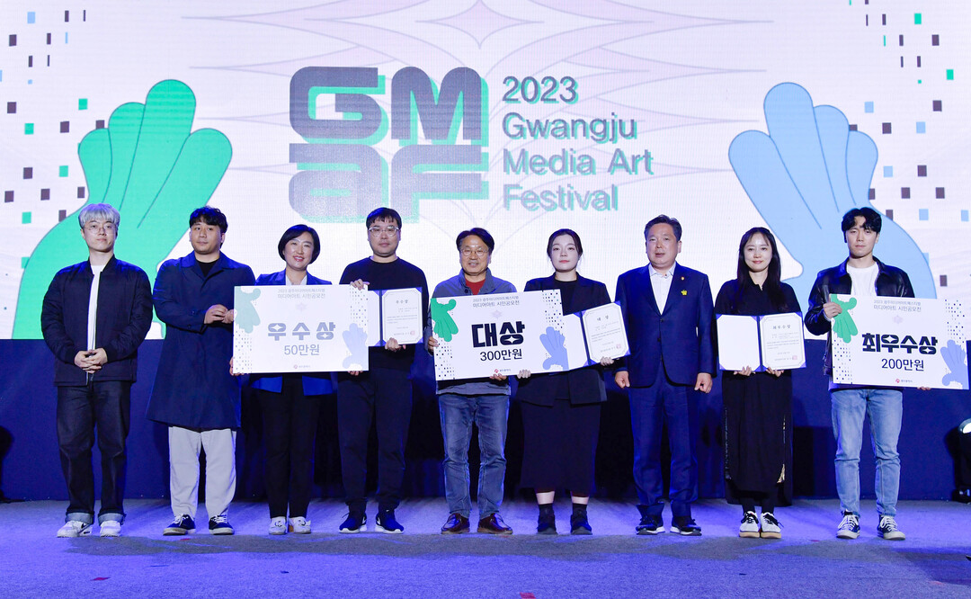 | ▲ 강기정 광주광역시장이 12일 오후 남구 광주미디어아트플랫폼 G.MAP에서 열린 '2023 광주미디어아트페스티벌' 개막식에 참석해 김병내 남구청장, 신수정 시의원과 시민공모전 수상자들에게 시상을 한 뒤 기념촬영을 하고 있다. [광주광역시 제공] |