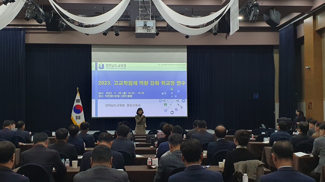 21일 전남교육청에 따르면 이번 연수는 일반계고 학교장 91명을 대상으로 2022 개정 교육과정과 2025년 고교학점제 전면 도입에 대비해, 학교장의 정책 역량 제고를 통한 단위학교 교육과정 운영 역량을 강화하기 위해 마련됐다.