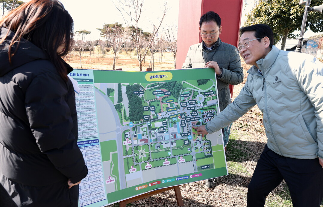 강 군수는 축제장을 찾을 관광객의 안전을 고려해 축제장 공간 구성과 부스 배치를 현장에서 검토한 뒤 다양한 체험 프로그램과 공연이 원활하게 운영될 수 있도록 무대와 주요 시설물을 둘러보며 점검했다.
