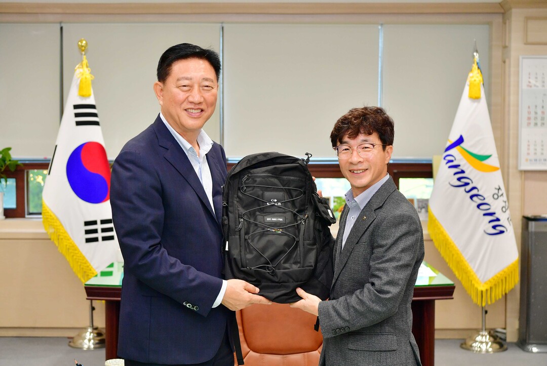 | ▲ 장흥모 농협중앙회 장성군지부장이 전남 장성지역의 학교 밖 청소년 등을 위해 써달라며 1700만 원 상당의 책가방 100개를 장성군에 전달한 뒤 김한종 장성군수와 기념촬영을 하고 있다. [장성군 제공] |