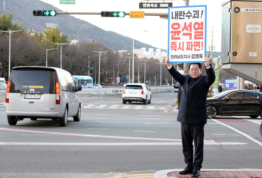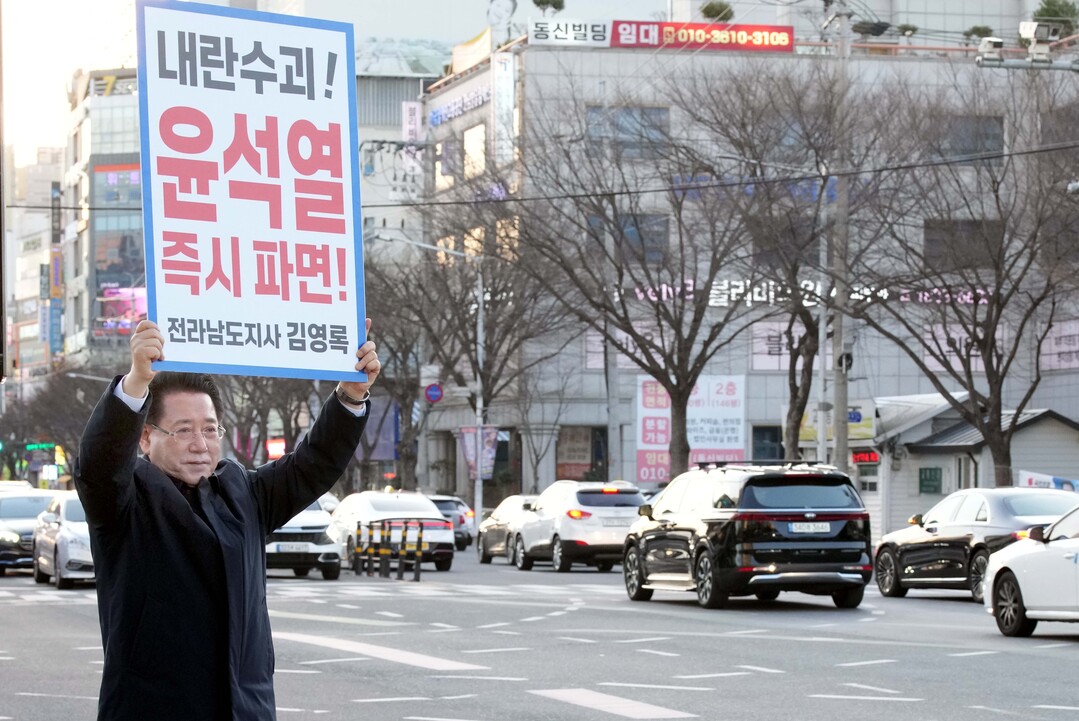 | ▲ 김영록 전라남도지사가 13일 오후 순천시 에코그라드호텔 앞 사거리에서 윤석열 대통령 탄핵을 촉구하는 1인 시위를 하고 있다. 김 지사는 이날 '내란수괴 윤석열 즉시파면!'이라고 적힌 피켓을 들고 퇴근길 시민들을 향해 호소했다. [독자 제공] |