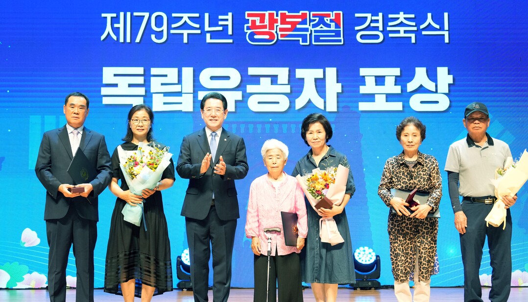 | ▲ 김영록 전라남도지사가 15일 도청 김대중강당에서 열린 제79주년 광복절 경축식에서 독립유공자에 대한 포상을 전수한 뒤 기념촬영을 하고 있다. [전남도 제공] |