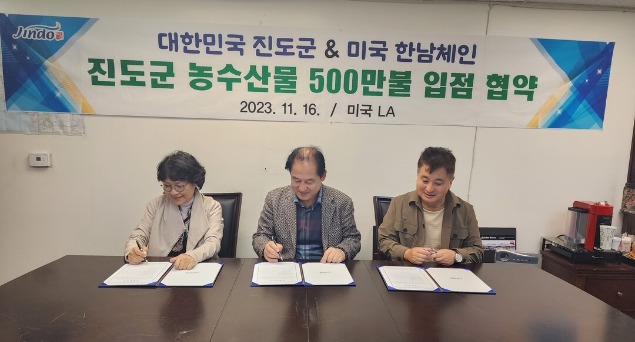 전남 진도군이 미국 현지 시간 지난 16일 미국 한남체인, 키트레이딩과 진도 농수산식품 500만 달러(한화 약 65억 원) 규모의 수출 협약을 체결했다고 17일 밝혔다.