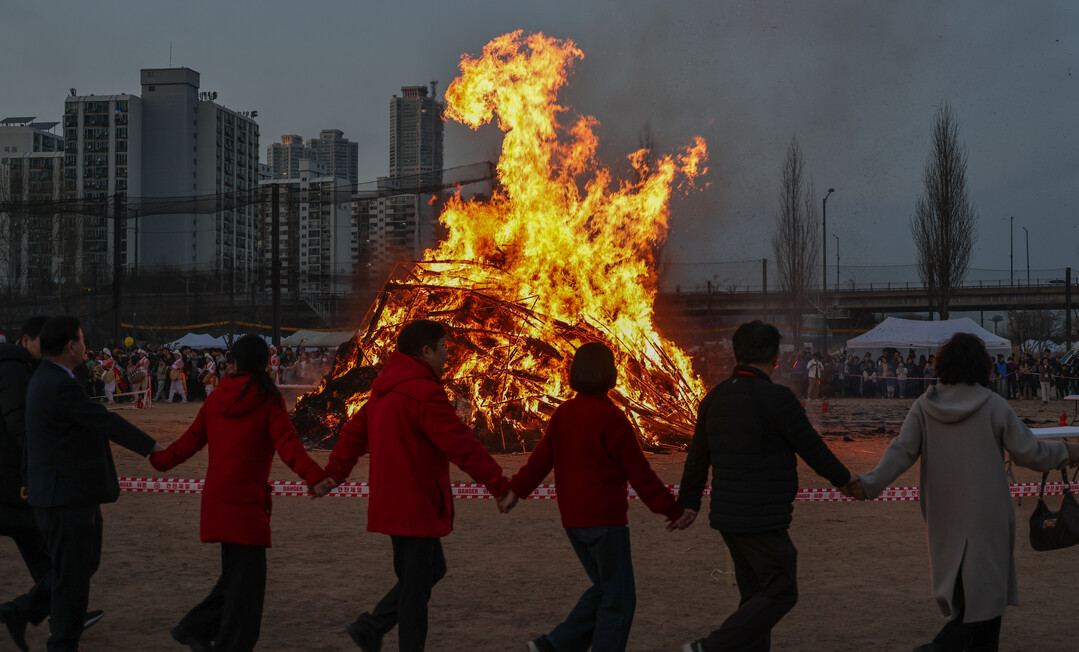 | ▲ 서울 양천구청이 28일 양천구 신정교 아래 안양천변에서 개최한 '정월대보름 민속축제'에서 참가자들이 달집이 타는 동안 서로 손을 잡고 강강술래를 하고 있다. [이상훈 선임기자] |