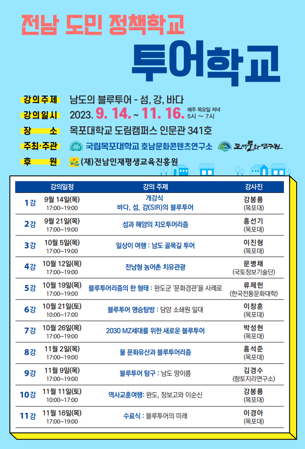 국립목포대학교 호남문화콘텐츠연구소와 도서문화연구원은 전남인재평생교육진흥원의 후원을 받아 14일부터 오는 11월 16일까지 ‘2023 전남도민 정책학교 프로그램’의 일환인 투어학교를 공동으로 진행한다.