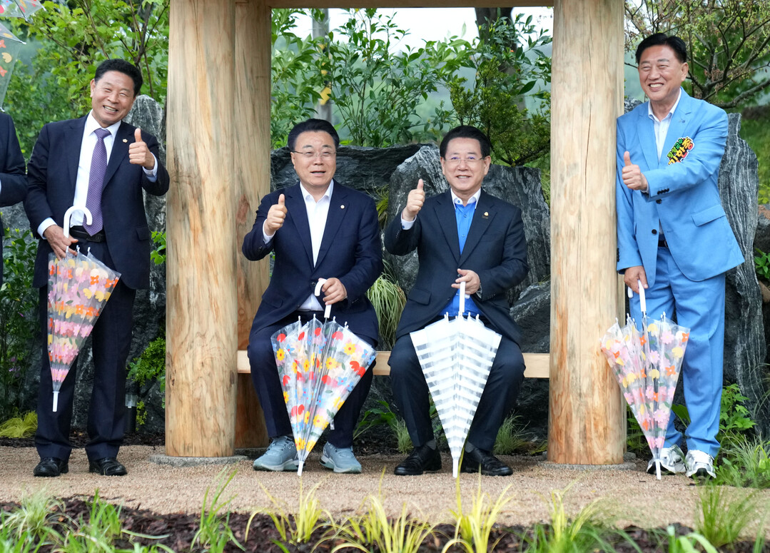 | ▲ 김영록 전라남도지사가 9일 장성 황룡강지방정원에서 열린 '2025 남도 K-가든 페스티벌 개막식'에 참석, 김한종(오른쪽) 장성군수, 구복규(왼쪽 두번째) 화순군수와 함께 정원을 둘러보고 있다. [전남도 제공] |
