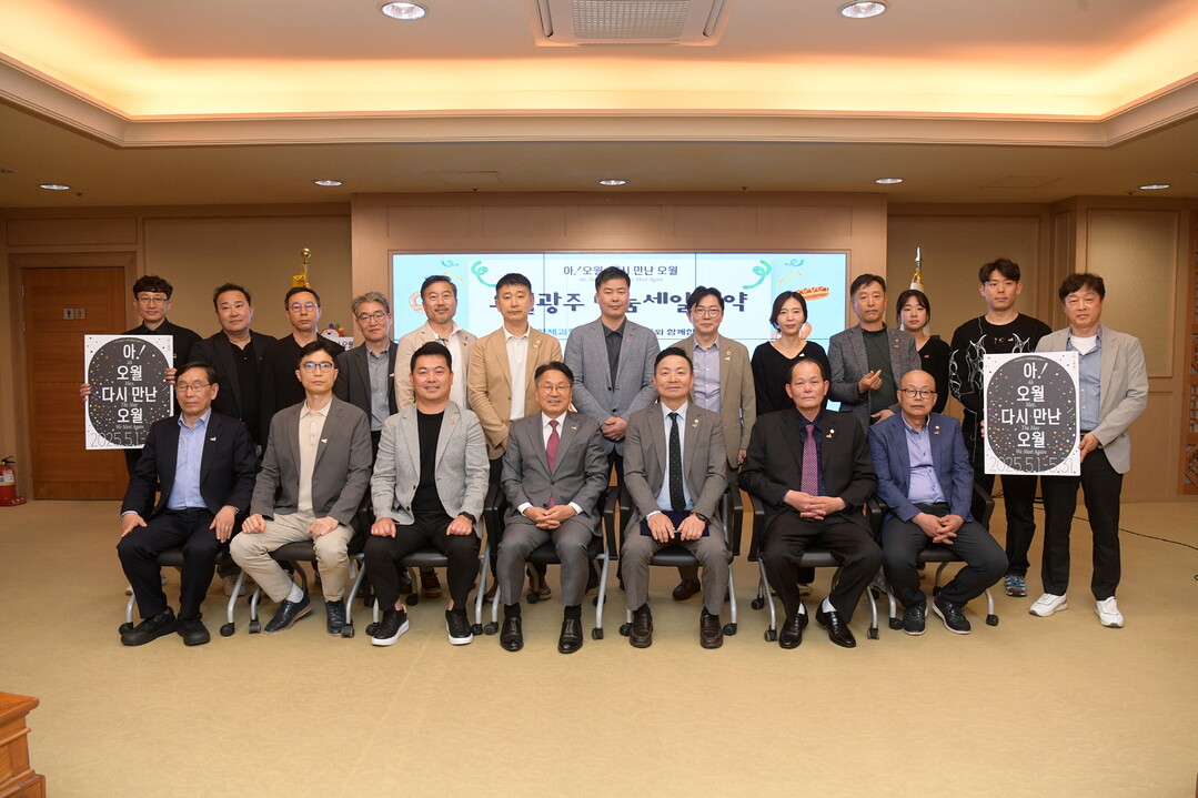 | ▲ 강기정 광주광역시장이 2일 오후 시청 비즈니스룸에서 이관교 대한제과협회 광주전남지회장과 '2025 오월광주 나눔세일 추진을 위한 업무협약'을 체결한 후 참석자들과 함께 기념촬영을 하고 있다. [광주광역시 제공] |