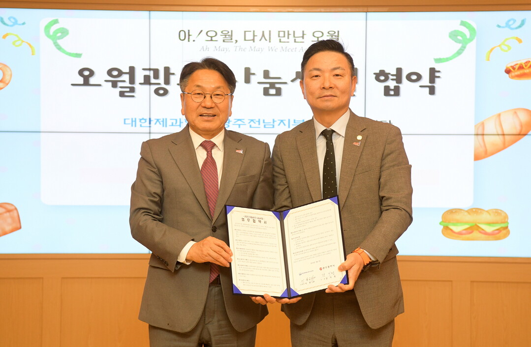 | ▲ 강기정 광주광역시장이 2일 오후 시청 비즈니스룸에서 이관교 대한제과협회 광주전남지회장과 '2025 오월광주 나눔세일 추진을 위한 업무협약'을 체결한 후 기념촬영을 하고 있다. [광주광역시 제공] |