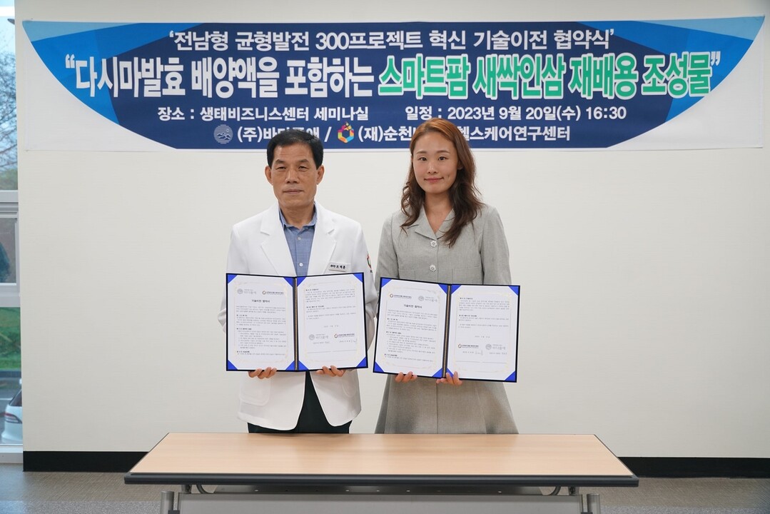 | ▲ 지난 20일 (재)순천바이오헬스케어연구센터 조태훈 미래산업국장과 정희진 (주)바다품애 대표가 기술이전 협약 체결한 뒤 기념촬영을 하고 있다. [순천시 제공] |