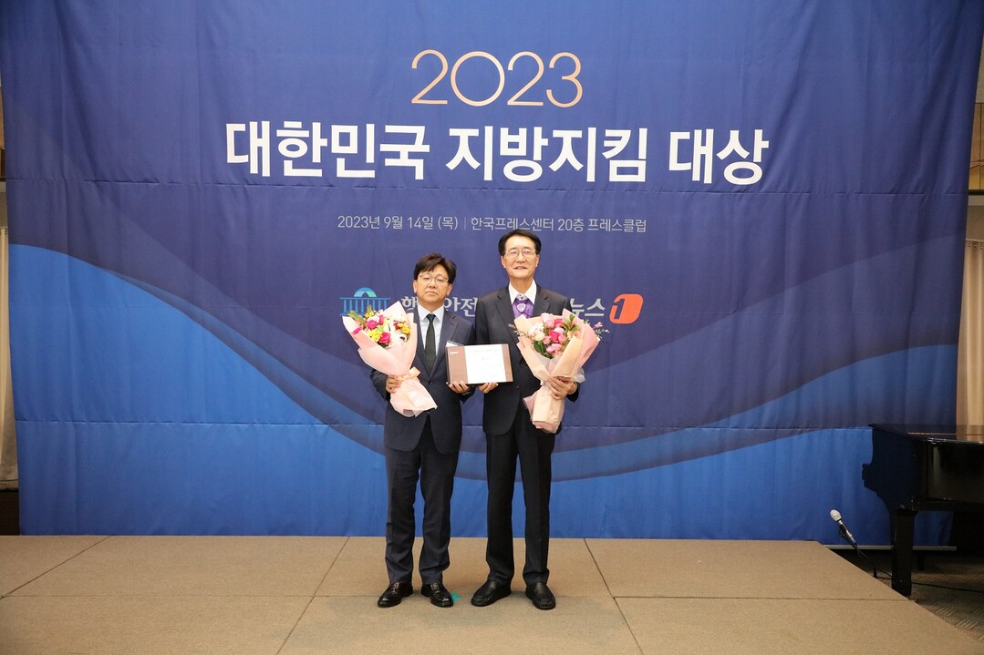 | ▲14일 박우량(오른쪽) 신안군수가 한국프레스센터에서 개최된 ‘대한민국 지방지킴 대상’ 시상식에서 영예의 대상을 수상힌 뒤 기념촬영을 하고 있다. [신안군 제공] |