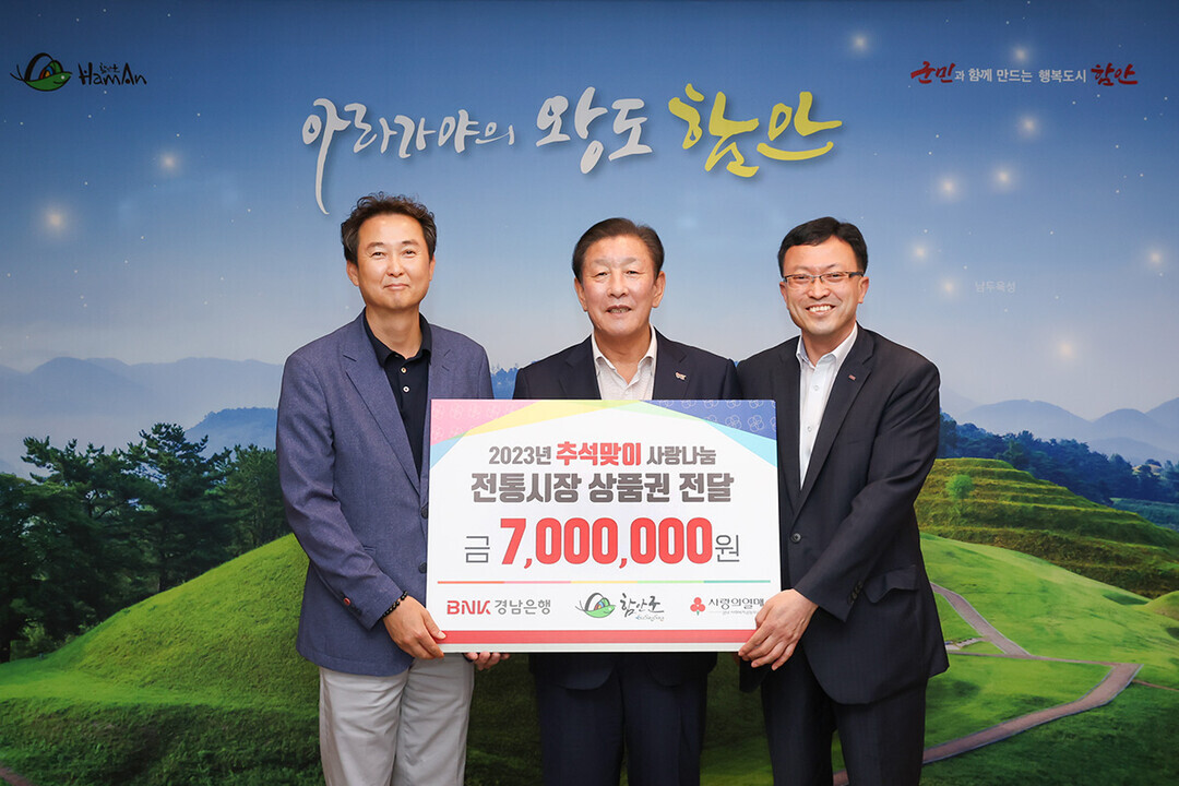 BNK경남은행 함안지점 사랑나눔재단(지점장 김정훈)은 8일 명절을 맞아 온누리상품권 700만 원을 함안군에 기탁했다.