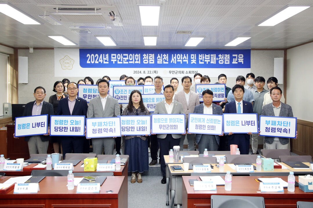 전남 무안군의회가 22일 4대 폭력 예방 교육과 청렴 실천 의지를 다짐하는 청렴 실천 서약식을 가졌다.