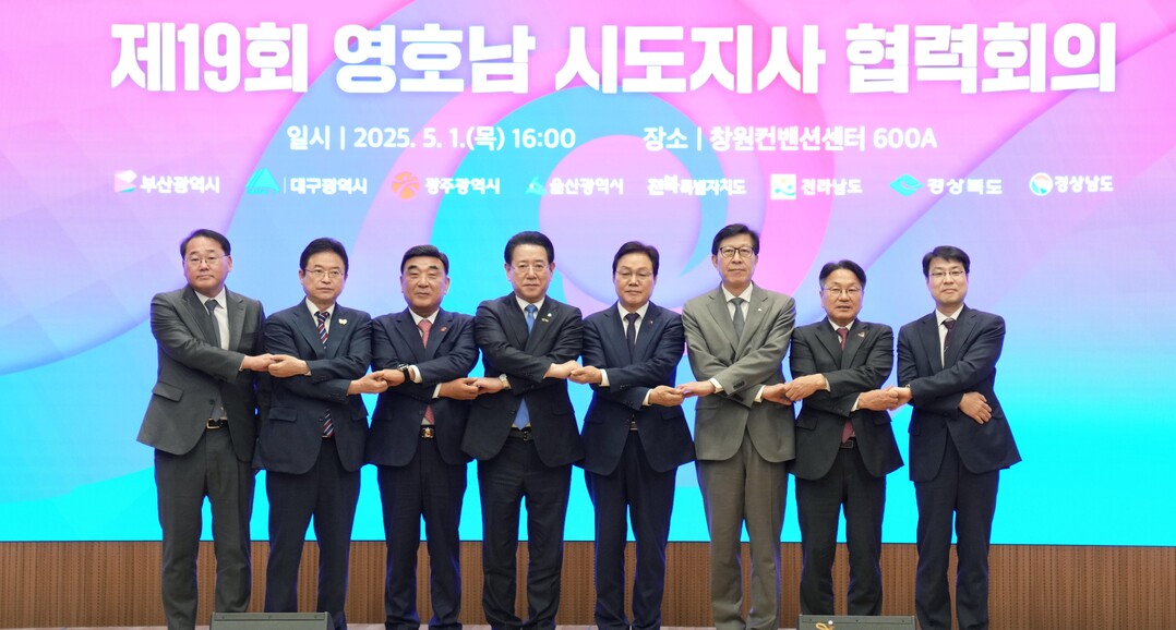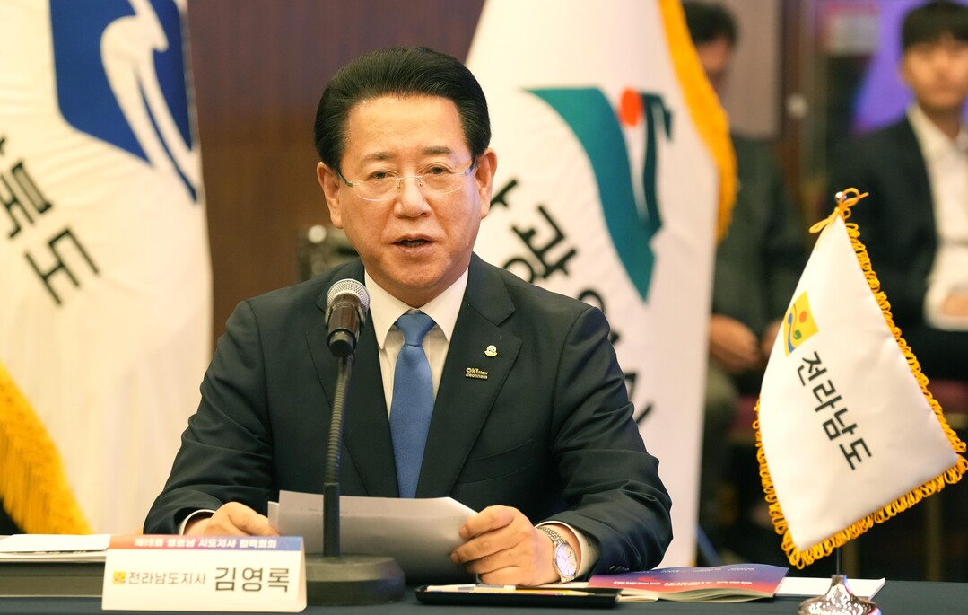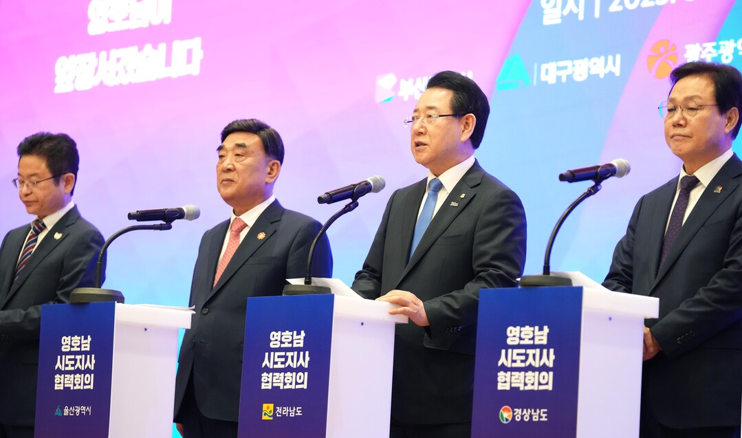 | ▲ 김영록 전라남도지사가 1일 경남 창원컨벤션센터에서 열린 '제19회 영·호남 시·도지사 협력회의'에 참석, 영·호남 시·도지사들과 공동성명서를 발표하고 있다. [전남도 제공] |