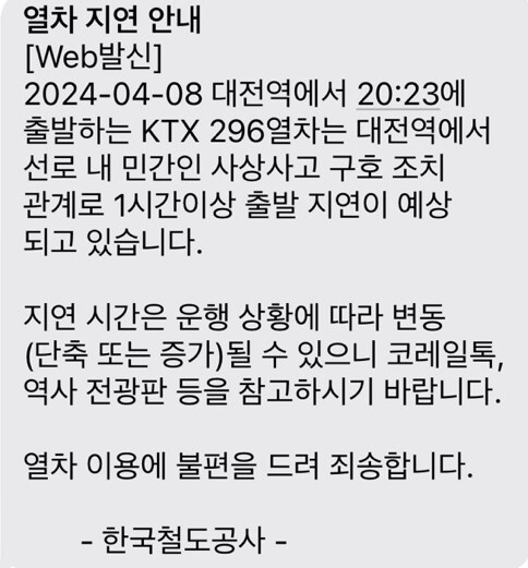 한국철도공사는 8일 오후 안내문자를 통해 '대전에서 오후 8시23분에 출발하는 KTX296 열차가 대전역에서 선로내 민간인 사상사고 구호조치 관계로 출발지연이 예상된다"고 밝혔다.