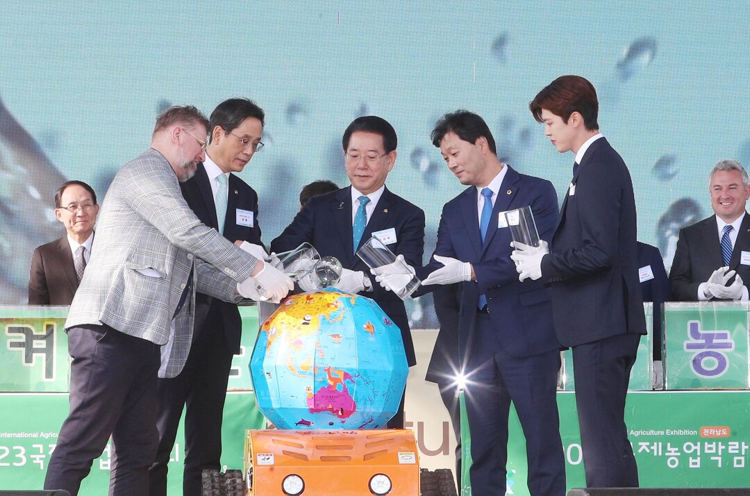 | ▲ 김영록 전라남도지사와 주요 내빈들이 12일 오후 순천만생태문화교육원에서 ‘지구와 인간의 건강을 지켜주는 농업’이라는 주제로 열린 2023 국제농업박람회 개막식에서 퍼포먼스를 하고 있다. [전남도 제공] |