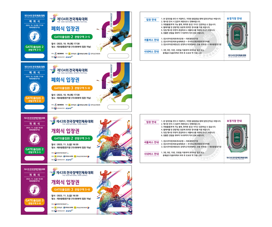 개·폐회식 입장권은 목포시와 무안군의 경우 시·군청 민원실과 읍면동 행정복지센터에서 배부하고, 그 외 20개 시군에서는 시·군청 민원실에서 1인당 2매까지 선착순으로 지급한다.