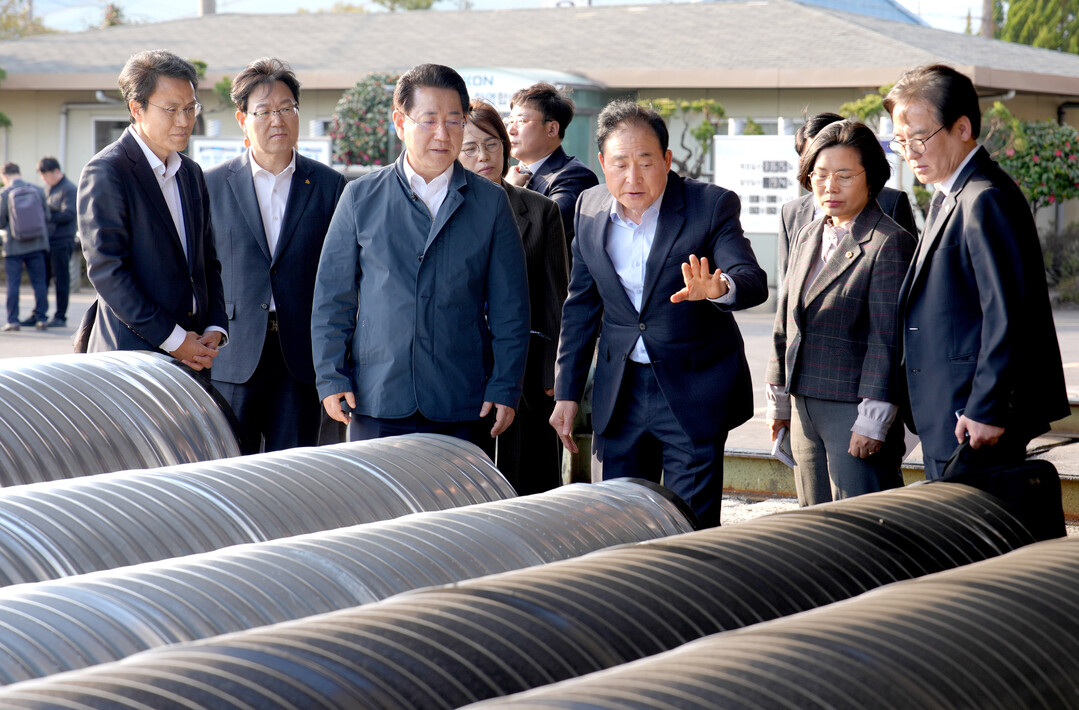 | ▲ 김영록 전라남도지사가 4일 오후 철구조물, 코일 등 강관을 제조하는 광양시 ㈜픽슨을 방문, 제조 현장을 둘러보고 있다. [전남도 제공] |