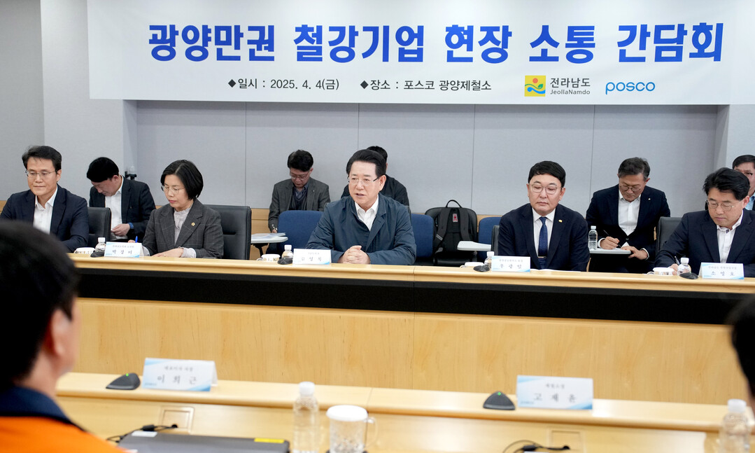 | ▲ 김영록 전라남도지사가 4일 오후 철구조물, 코일 등 강관을 제조하는 광양시 ㈜픽슨을 방문, 미국 트럼프 2기 행정부의 상호관세 부과조치에 따른 애로사항을 청취하고 통상위기 극복을 위한 대응 방안 등을 논의하고 있다. [전남도 제공] |