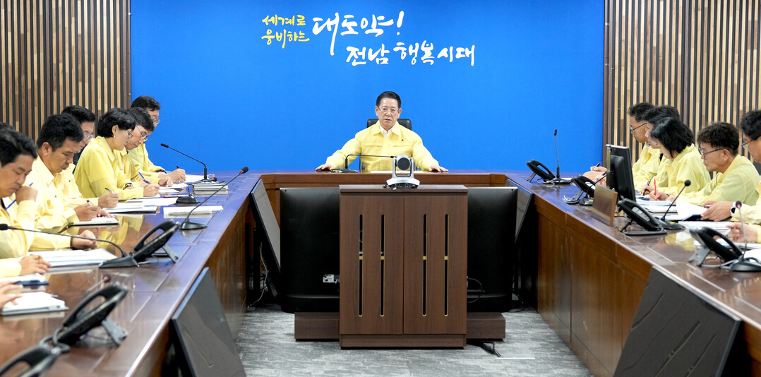 | ▲ 김영록 전라남도지사가 13일 재난종합상황실에서 실국장 등이 참석한 가운데 열린 '집중호우 대비 대처상황보고회'에서 "도민의 생명과 재산, 주요시설 보호에 철저히 대비 해줄 것"을 당부하고 있다. [전남도 제공] |