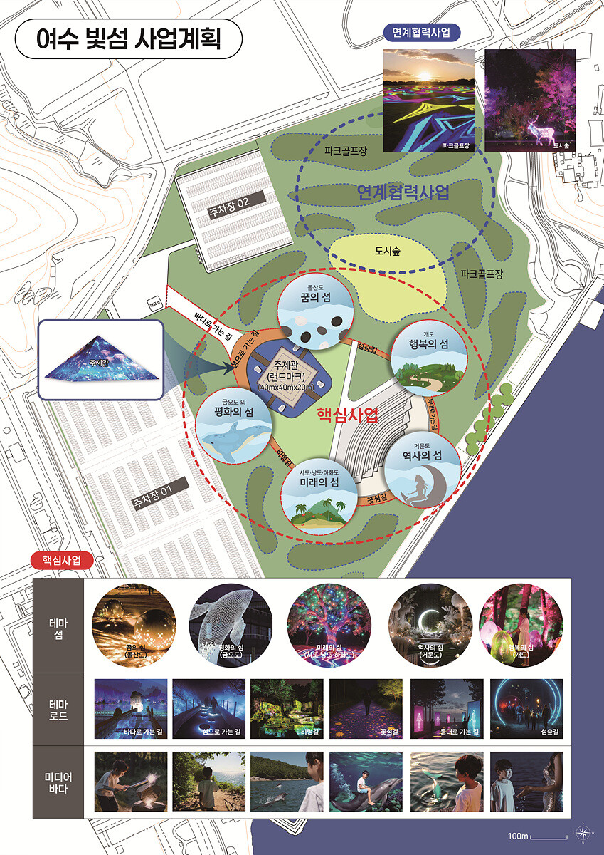 주요 사업은 여수를 대표하는 섬을 영상조명으로 표현한 '테마 섬', 섬별 특색을 담은 테마 로드 '여수 빛섬길', 프로젝션 맵핑과 몰입형 영상, 인터랙티브 체험시설 등 디지털 기술을 활용한 '미디어바다' 등이다.