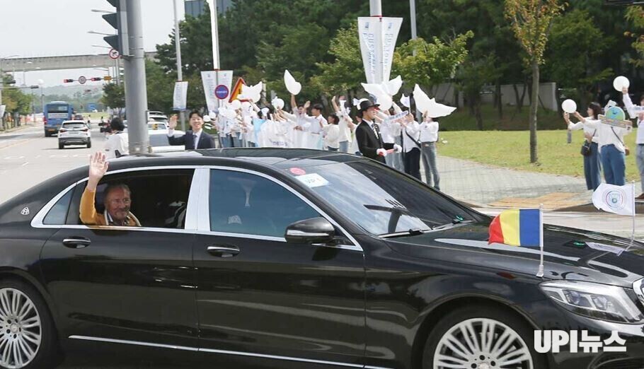 | ▲ 에밀 루마니아 전 대통령이 16일 오전 HWPL이 주최하는 평화만국회의 제9주년 기념식에 참석하기 위해 인천국제공항을 통해 입국, 숙소 앞 청년들의 환영 도열에 손을 흔들며 화답하고 있다. [HWPL 제공] |