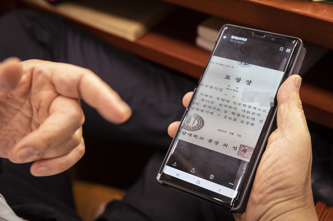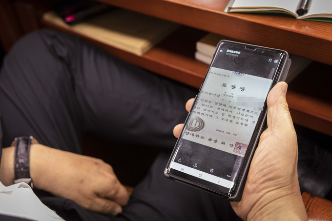 대안정치연대 박지원 의원이 6일 조국 법무부장관 후보자 인사청문회 중 기자들에게 조국 후보자 딸의 동양대 표창장 이미지 파일을 보여주고 있다.