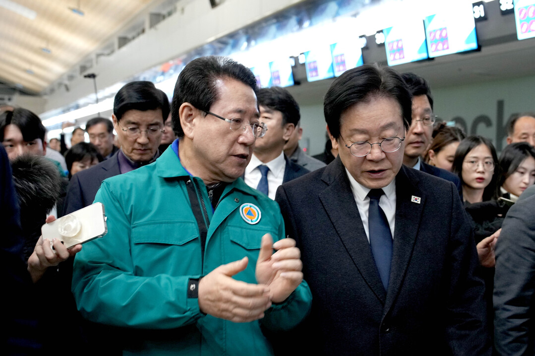 | ▲ 이재명 더불어민주당 대표가 29일 오후 전남 무안군 무안국제공항을 방문, 제주항공 여객기 폭발사고 탑승객 유가족들을 위로하고 김영록 전라남도지사와 긴급현안에 대한 이야기를 나누고 있다. [전남도 제공] |